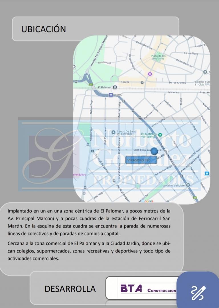 Tu nuevo hogar te espera en Morón, Palomar! Con entrega pactada para SEPTIEMBRE 2027 Descubre un espacio ideal para vivir en el corazón de un barrio residencial tranquilo: Cnel. Benjamín Virasoro 330. Este moderno edificio ofrece departamentos de 2 y 3 ambientes, perfectos para disfrutar de la comodidad y el confort que mereces. Características destacadas: Excelente conectividad: A minutos de la estación san Martín y con fácil acceso a importantes avenidas Diseño y confort: Departamentos equipados con Doble Vidrio Hermético (DVH) Comodidades modernas: Ascensores automáticos y portero eléctrico visor que garantizan seguridad y facilidad de acceso. Vivir aquí significa disfrutar de un ambiente sereno, ideal para familias y profesionales que buscan calidad de vida sin alejarse de la ciudad. No pierdas la oportunidad de formar parte de esta maravillosa comunidad! Contáctanos para más información y descubre tu nuevo hogar en palomar.